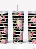 - 20 oz Skinny Tumbler, Black Stripes and Floral Tumbler, Pink Flowers Tumbler, Gift for Valentine's Day, 20 oz Stainless Steel Tumbler
