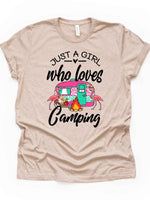 Camping Tee, Just A Girl Who Loves Camping, Camper and Flamingos Design on premium shirt, 3 color choices, 3x Camping, 4x Camping