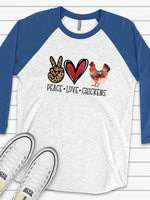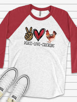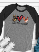 Chicken Raglan, PEACE LOVE CHICKENS, Chicken Mom, Love Chickens Design on premium Raglan 3/4 sleeve shirt, plus size, 2X, 3X
