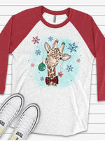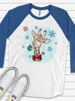 - Christmas Raglan, Cute Christmas Giraffe with Snowflakes, Giraffe and Ornament Design on premium Raglan 3/4 sleeve shirt, plus size, 2X, 3X
