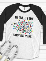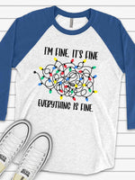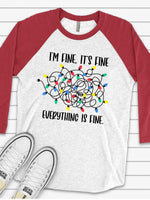 Christmas Raglan, Funny Christmas, Tangled Christmas Lights, Everything Is Fine Design on premium Raglan 3/4 sleeve shirt, plus size, 2X, 3X