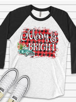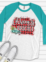 Christmas Raglan, Merry and Bright Old Blue Truck Red and Black Buffalo Plaid Design on premium Raglan 3/4 sleeve shirt, plus size, 2X, 3X