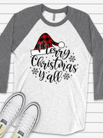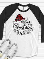 - Christmas Raglan, Merry Christmas Y'all Red Buffalo Plaid Santa Hat Design on premium Raglan 3/4 sleeve shirt, plus size, 2X, 3X