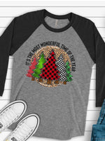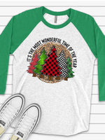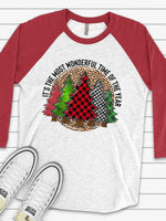 - Christmas Raglan, Most Wonderful Time of the Year, Christmas Trees in Plaid Design on premium Raglan 3/4 sleeve shirt, plus size, 2X, 3X