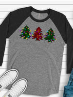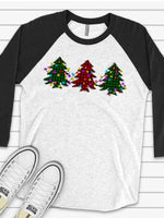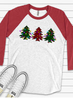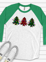- Christmas Raglan, Red & Green Plaid Trees with Lights, Plaid Christmas Trees Design on premium Raglan 3/4 sleeve shirt, plus size, 2X, 3X