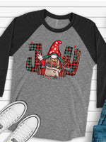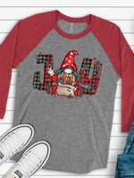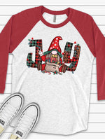 - Christmas Raglan, Super Cute JOY Christmas Gnome, Gnome with Christmas Gifts Design on premium Raglan 3/4 sleeve shirt, plus size, 2X, 3X