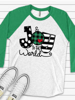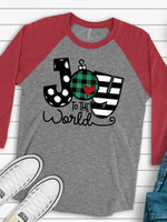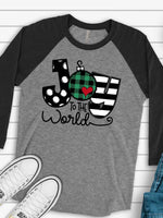 - Christmas Raglan, Super Cute JOY to the World, Plaid Ornament JOY Design on premium Raglan 3/4 sleeve shirt, plus size, 2X, 3X
