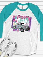 - Easter Raglan, Happy Easter, Retro Truck Easter Design on premium Raglan 3/4 sleeve shirt, plus size, 2x easter raglan, 3x easter raglan