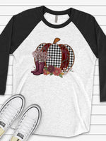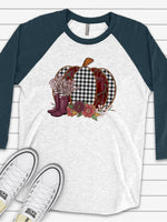 Fall and Pumpkins Tee, Black and White Plaid Pumpkin with Boots Design on premium Raglan 3/4 sleeve shirt, plus size, 2X, 3X