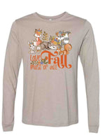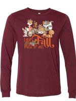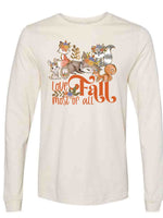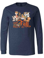 Fall Long Sleeve Tee, I Love Fall Most of All with Woodland Animals Design on premium unisex long sleeve tee, 3x plus size long sleeve