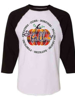Fall Raglan, Plaid Pumpkin with Fall Words, Fall Pumpkin Design on premium Raglan 3/4 sleeve shirt, plus size, 2X raglan, 3X raglan