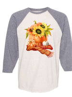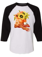 Fall Raglan, Pretty Fall Pumpkin with Sunflowers and Scarf Design on premium Raglan 3/4 sleeve shirt, plus size, 2X raglan, 3X raglan