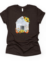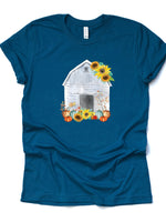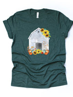 Fall Sunflowers Tee, Old Barn with Sunflowers and Pumpkins, Wooden Barn Design on premium unisex shirt, 3 color choices, 3x fall, 4x fall