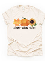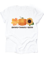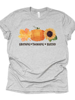 Fall Tee, Grateful, Thankful, Blessed Tee, Leaf, Pumpkin and Sunflower Design on premium unisex shirt, 3 color choices, 3x fall, 4x fall