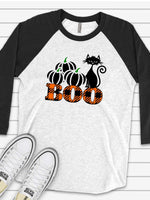 Halloween Raglan, Super Cute Black Cat on Orange Plaid Pumpkin BOO Design on premium Raglan 3/4 sleeve shirt, plus size, 2X, 3X