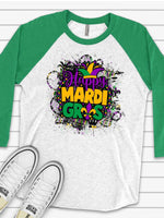 - Mardi Gras Raglan, Super Cute Happy Mardi Gras with Fleur De Lis Design on premium Raglan 3/4 sleeve shirt, plus size, 2X, 3X