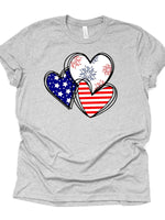 - Patriotic Tee, 3 Patriotic Hearts with Stripes and Fireworks Design on premium unisex shirt, 3 color choices, 3x Patriotic, 4x Patriotic