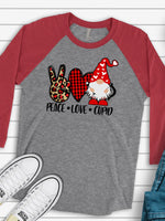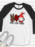 - PEACE LOVE GNOME, Valentine's Day Raglan, Peace, Love, Gnome Cupid Valentine Design on premium Raglan 3/4 sleeve shirt, plus size, 2X, 3X
