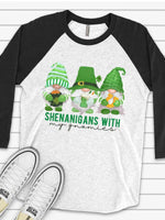 St. Patrick's Day Raglan, Shenanigans with My Gnomies, St Patrick Gnomes Design on premium Raglan 3/4 sleeve shirt, plus size, 2X, 3X