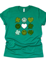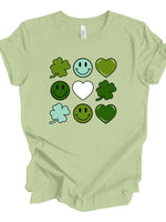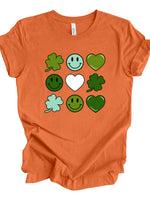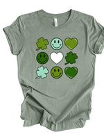 St Patrick's Day Tee, Super Cute Hearts, Clovers and Smiley Faces Design, premium unisex tee, 3 color choices, 3x st patrick, 4x st patrick