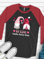 - Valentine's Day Raglan, Cute Be Kind Valentine Day Gnomes, Be Kind Gnomes Design on premium Raglan 3/4 sleeve shirt, plus size, 2X, 3X