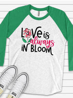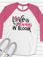 - Valentine's Day Raglan, Cute Love Is Always In Bloom, Valentine Love Flower Design on premium Raglan 3/4 sleeve shirt, plus size, 2X, 3X