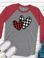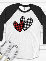 - Valentine's Day Raglan, Cute Red And Black Buffalo Plaid Hearts Valentine Design on premium Raglan 3/4 sleeve shirt, plus size, 2X, 3X