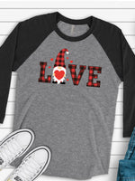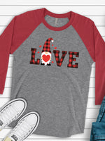 - Valentine's Day Raglan, Cute Red And Black Buffalo Plaid LOVE Gnome Valentine Design on premium Raglan 3/4 sleeve shirt, plus size, 2X, 3X