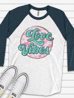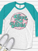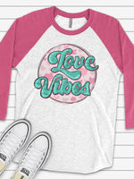 - Valentine's Day Raglan, Super Cute Retro Love Vibes, 70s Style Love Pink Hearts Design on premium Raglan 3/4 sleeve shirt, plus size, 2X, 3X