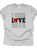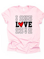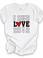- Valentine's Day Tee, Repeating LOVE with Red Heart, Love Echo with Heart Design, premium unisex shirt, 3 color choices, plus valentine tee