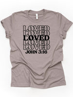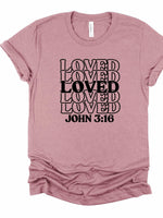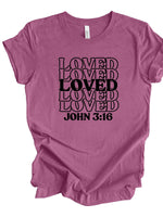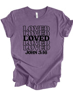 - Valentine's Day Tee, Repeating LOVED, Loved John 3:16, Christian Valentine Design, premium unisex shirt, 3 color choices, plus valentine tee