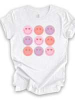 - Valentine's Day Tee, Super Fun Valentine Smiley Faces, Smiley Face Hearts Design, premium unisex shirt, 3 color choices, plus valentine tee
