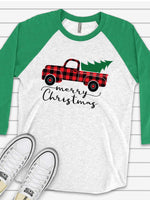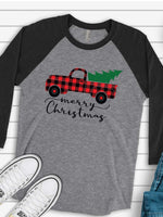 Christmas Raglan, Cute Buffalo Plaid Truck with Christmas Tree, Merry Christmas Design on premium Raglan 3/4 sleeve shirt, plus size, 2X, 3X