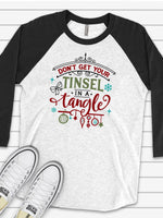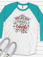 Christmas Raglan, Don't Get Your Tinsel in a Tangle Funny Chrsitmas Design on premium Raglan 3/4 sleeve shirt, plus size, 2X, 3X