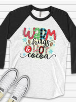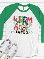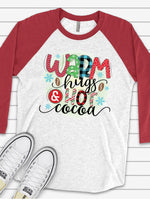 Christmas Raglan, Super Fun Warm Hugs and Hot Chocolate, Winter Time Hot Cocoa Design, premium Raglan 3/4 sleeve shirt, plus size, 2X, 3X