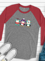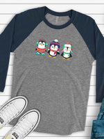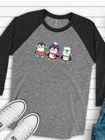 Christmas Raglan, Three Super Cute Penguins, Wintertime Penguins Design on premium Raglan 3/4 sleeve shirt, plus size, 2X, 3X