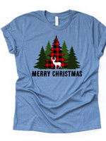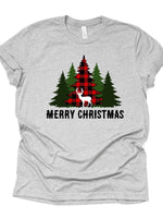 Christmas Tee, Christmas Deer with Red Buffalo Plaid Tree and Green Trees Design on premium cotton unisex shirt, plus sizes, 2x, 3x, 4x