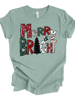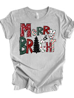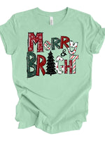 Christmas Tee, Super Fun Merry and Bright with Christmas Tree, Merry Word Art Design on premium cotton unisex shirt, plus sizes, 2x, 3x, 4x