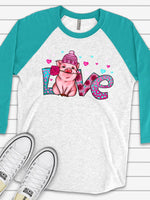 - Valentine's Day Raglan, Cute Valentine Pig, LOVE Valentine Pig with Rose Design on premium Raglan 3/4 sleeve shirt, plus size, 2X, 3X