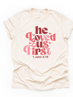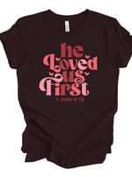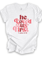 - Valentine's Day Tee, Christian He Loved Us First, 1 John 4:19 Design, premium unisex shirt, 3 color choices, 3x valentine, 4x valentine