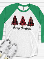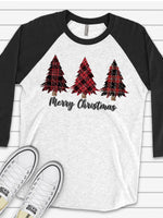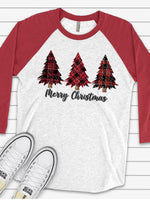 - Christmas Raglan, Cute Red Buffalo Christmas Trees in Snow, Christmas Trees Design on premium Raglan 3/4 sleeve shirt, plus size, 2X, 3X