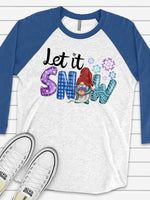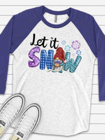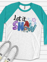 - Christmas Raglan, Let It Snow, Cute Winter Gnome with Snow Design on premium Raglan 3/4 sleeve shirt, plus size, 2X, 3X