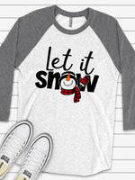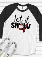 - Snowman Raglan, Cute Let It Snow Snowman with Plaid Scarf and Carrot Nose Design on premium Raglan 3/4 sleeve shirt, plus size, 2X, 3X