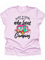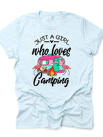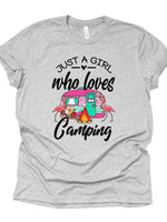 Camping Tee, Just A Girl Who Loves Camping, Camper and Flamingos Design on premium shirt, 3 color choices, 3x Camping, 4x Camping