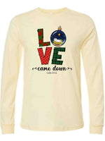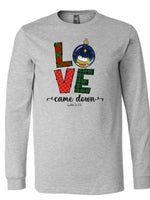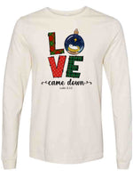 - Christmas Long Sleeve, LOVE Came Down with Nativity Scene Ornament Design on premium unisex long sleeve tee, 3x plus size long sleeve