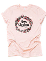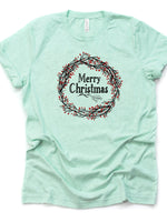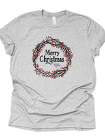 - Christmas Shirt, Red Berry Wreath, Merry Christmas Wreath Design on premium Bella + Canvas unisex shirt, 3 color choices, plus sizes
