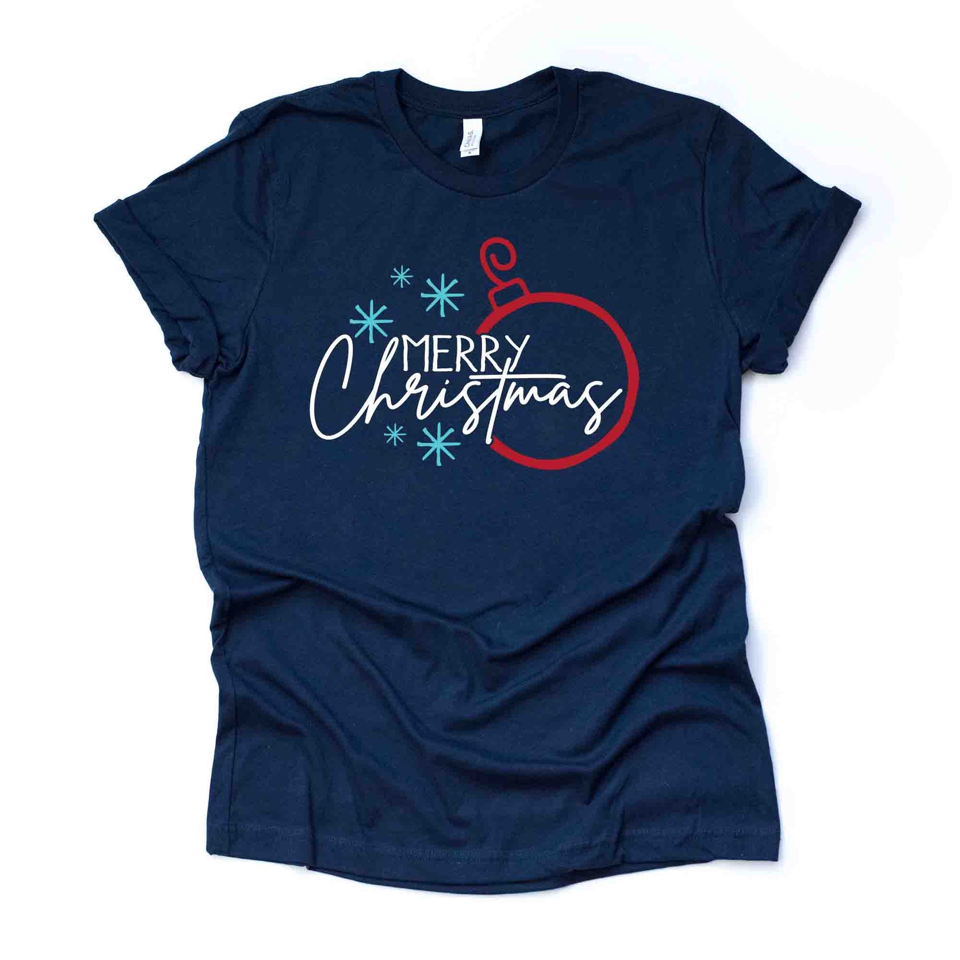 Christmas Tee, Simple Merry Christmas with Snowflakes and Ornament Design on premium unisex shirt, 2 color choices, plus sizes available