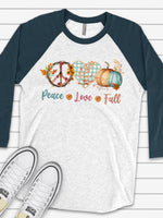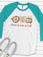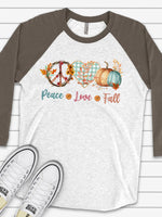 Fall Plaid Heart & Pumpkin Raglan, Cute PEACE, LOVE, FALL, Vine Peace Sign Design on premium Raglan 3/4 sleeve shirt, plus size, 2X, 3X