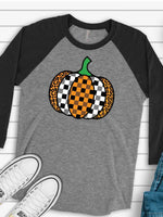 Fall Pumpkin Raglan, Super Fun Buffalo Plaid and Leopard Pumpkin Design on premium Raglan 3/4 sleeve shirt, plus size, 2X, 3X