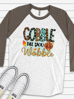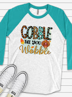 Fall & Thanksgiving Raglan, Super Fun Gobble Til You Wobble Teal and Tan Turkey Design on premium Raglan 3/4 sleeve shirt, plus size, 2X, 3X